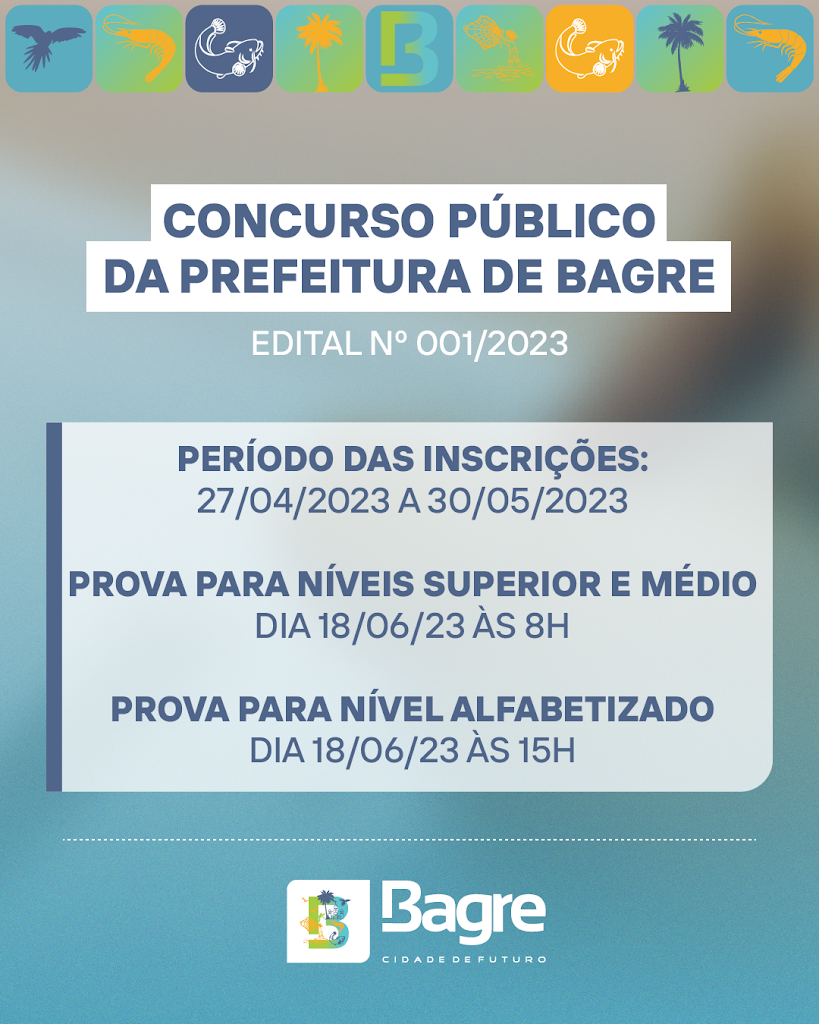 A Prefeitura Municipal de Bagre, no Pará, publicou o edital do seu mais novo concurso público. São oferecidas 297 vagas, sendo 71 para provimento imediato e 226 para formação de cadastro de reserva. Os cargos são para os níveis alfabetizado, médio, técnico e superior, nas áreas de administração, enfermagem, fiscalização, serviço social, farmácia, fisioterapia, saúde, educação e outras.